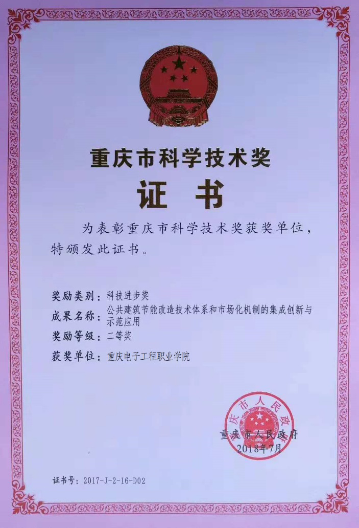 公司林学山老师,与重庆市设计院等科研团队,针对既有公共建筑节能改造工作中存在的技术选型难、节能评估慢、运营管理效率低等共性技术难题以及市场资源未能充分调动、规模化推进阻力大等机制、模式障碍,开展了系统研究,形成了“公共建筑节能改造技术体系和市场化机制”成果,实现了覆盖节能改造全生命周期技术集成、市场化运行机制到工程建设模式的全链条集成创新。通过实施500余万㎡应用推广项目,形成了一整套可复制、易实施的改造工程建设新模式。该成果有效提升了改造效果、降低了改造成本、缩短了核定周期、提高了运管效率,可推广性强,达到国内领先水平。公司教师林学山作为《公共建筑节能改造技术体系和市场化机制的集成创新与示范应用》的第二完成人,学校作为第二完成单位,获重庆市科技进步二等奖。