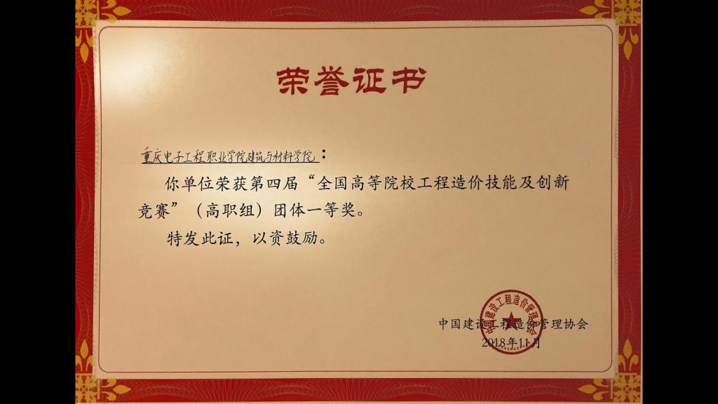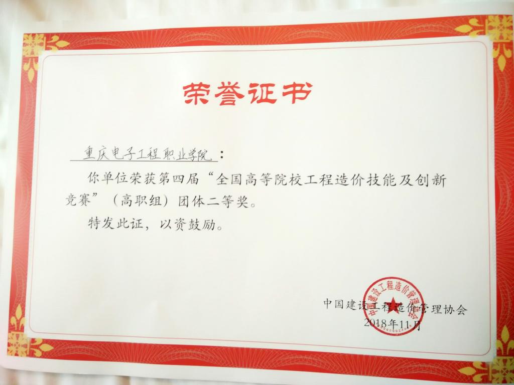 2018年11月17日,由中国建设工程造价管理协会主办、广东交通职业技术学院承办、深圳市斯维尔科技股份有限公司协办的“第四届全国高等院校工程造价技能及创新竞赛”在广州顺利举行,重庆电子工程职业学院太阳成集团tyc122cc员工喜获团体一等奖、团体二等奖。