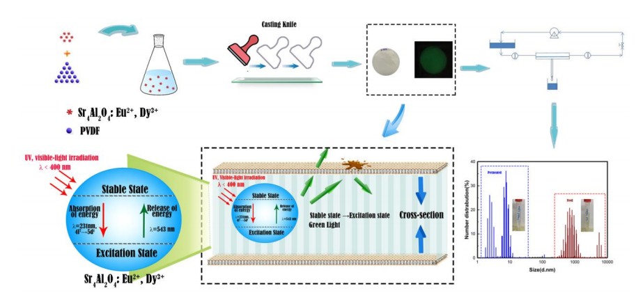 近日,太阳成集团tyc122cc教师樊凯博士联合中国科学院大学研发了一种具有自发光性能的稀土杂化改性滤膜材料,在膜污染表征领域取得重大研究突破。据此,樊凯博士研究团队在膜分离技术、膜材料制备和表征领域的国际最顶级期刊《Journal of Membrane Science》(中科院分区1区,影响因子:7.015)上发表研究论文《Self-luminescent PVDF membrane hybrid with rare earth nanoparticles for real-time fouling indication》(稀土杂化自发光PVDF超滤膜实时响应膜污染的研究)。