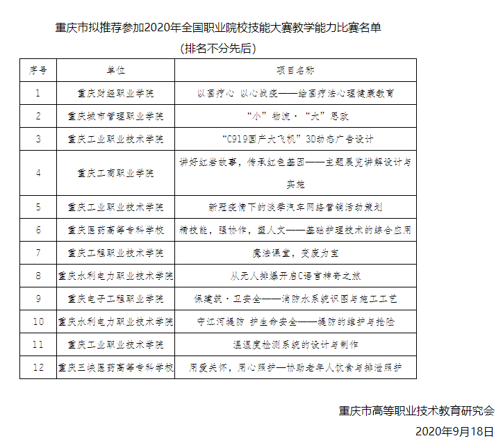 2020年9月17日,“重庆市高职院校教学能力比赛”现场决赛在重庆工业职业技术学院举行。本次大赛由重庆市教委主办、重庆市高等职业技术教育研究会承办。由网络初赛的165支参赛队伍选拔出49支队伍进入现场决赛,最终选出12支队伍推荐参加国家级高职院校教学能力比赛。