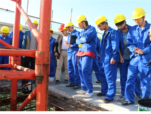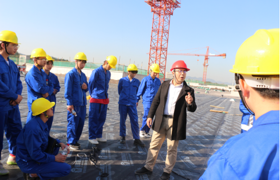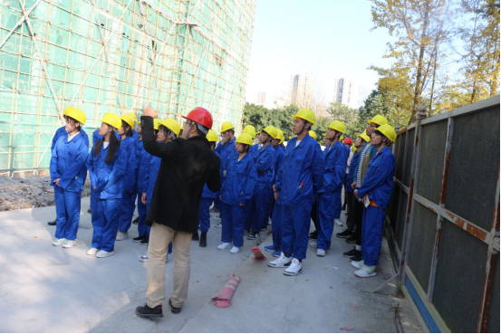 太阳成集团tyc122cc于2020年11月11日下午在公司1#实训楼工地开展了实践教学活动。在专业课祝骎钦老师、辅导员高一丹老师以及现场施工人员的陪同下,40多名大一员工着装整齐,佩戴好安全帽,在学习了安全知识和相关要求后,有秩序地进入工地进行现场的观摩、学习。