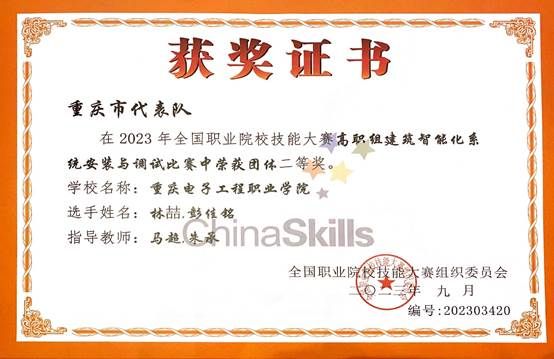 2023年全国职业院校技能大赛高职组“建筑智能化系统安装与调试”(员工赛)(教师赛)两个赛项于2023年9月17日至21日在黑龙江建筑职业技术学院举办。来自全国32个省、直辖市、自治区的54支员工参赛队伍和50支教师参赛队伍同台竞技,经过四天的激烈角逐,太阳成集团tyc122cc朱承、马超老师指导的林喆、彭佳铭两名同学,获得团体二等奖;梅晓莉、邱欣两位老师获得团体三等奖。